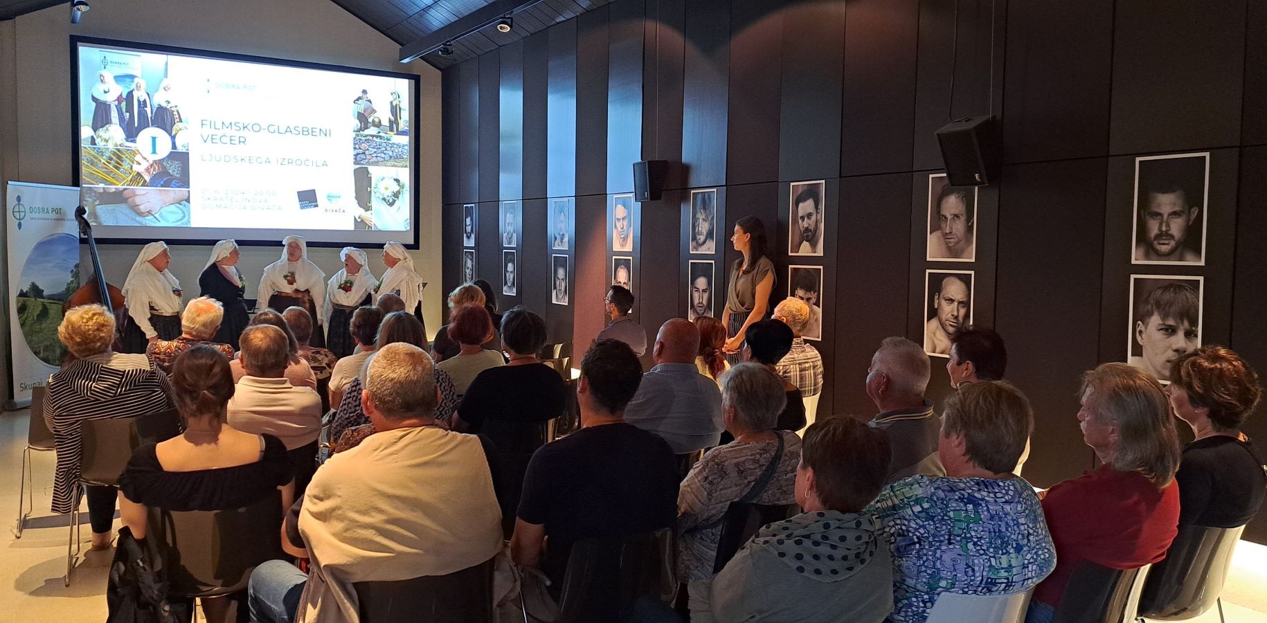 Večer je začel program ljudskih pesmi in plesa v izvedbi folklorne skupine Kraški šopek, ki je s svojimi nastopi pričarala čudovito vzdušje. Nato smo predvajali dokumentarne filme iz projekta Izročilo Brkinov in Krasa. Na sporedu so bili filmi: