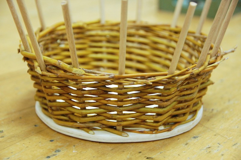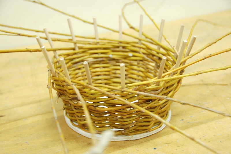 Tokrat smo pletli košare iz bekinih šib. Za mlade pletarje, ki so se pletilnim materialom srečali že na prejšnjih naših delavnicah, smo vnaprej pripravili leseno osnovo, v katero so potem vpletali bekine šibe po dveh različnih vzorcih. Nekaj časa smo pletli kar s petnajstimi šibami hkrati in tako je hitro nastala stena košare ter s tem tudi končani izdelki.