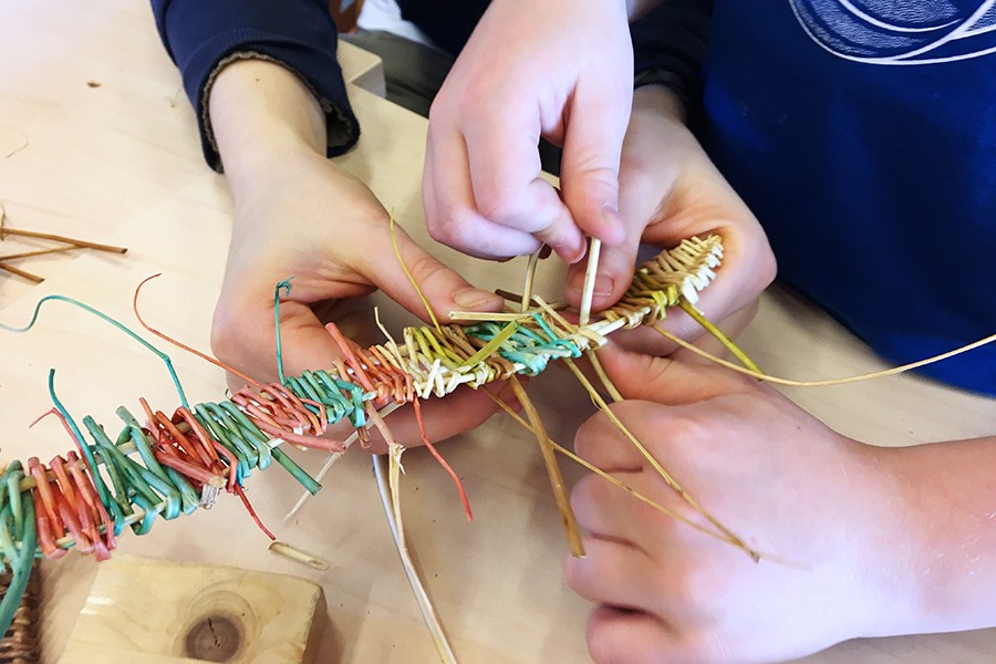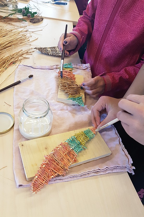 Ko smo se dobro ogreli, smo začeli ustvarjati. Ker smo tokrat sodelovali z Otipom narave, so nas na mizah pripravljene čakale vrbove veje in to prav posebne — nekatere so bile namreč obarvane. Takoj smo se lotili pletenja — raznih podstavkov, obeskov za ključe oz. kar smo si zaželeli. Pletli smo in poleg podstavkov spletali še vezi med nami. Delo nam je šlo res spretno in hitro od rok. Celo tako zelo, da smo imeli pred odhodom domov še čas, da smo zopet izzvali zmaja v njegovi tako dobro čuvani jami. Uspelo nam ga je premagati … večkrat.