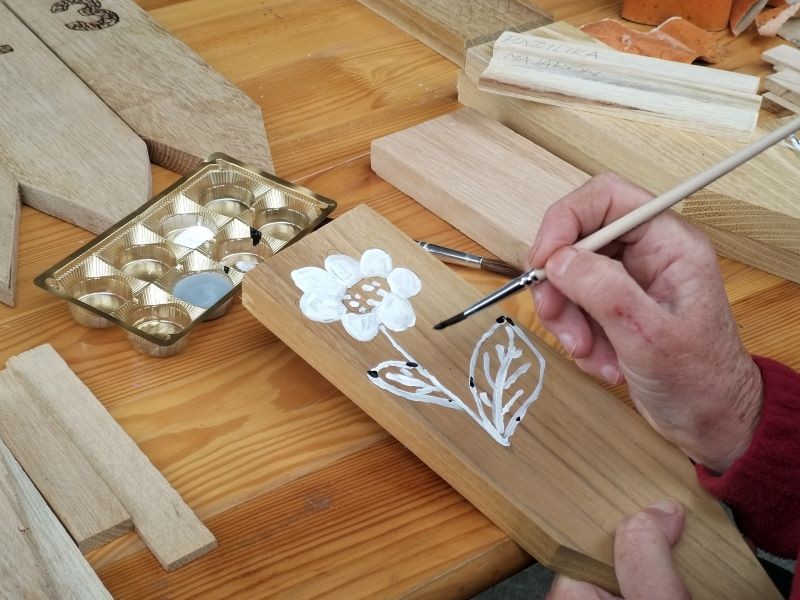 Ob zavedanju, da se plastika razkraja stoletja, smo se z veseljem in veliko vnemo lotili izdelovanja označevalcev za gredice in za zeliščni vrtiček iz odpadnih kosov lesa, ki smo jih dobili pri mizarju. Za lep izgled in dober oprijem barve smo ročno pobrusili in narisali ali vžgali oznake v že pripravljene označevalce za gredice, male in velike. Oznake bodo služile za boljše razpoznavanje rastlin in ločevanje med posevki.